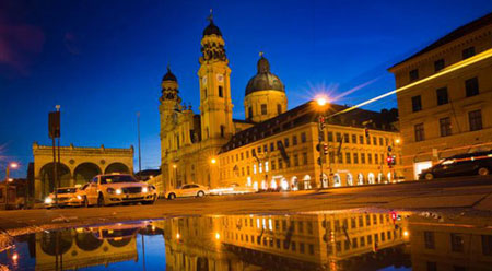 اینجا یکی از زیباترین مناطق شهر مونیخ به نام „Odeonsplatz” است. گفته میشود که این ناحیه از شهر به دلیل داشتن کافههای کوچک و زیبا بیشتر شباهت به شهرهای ایتالیایی دارد. شاید هم دلیلش سبک معماری کلیسای اینجاست (Theatinerkirche) که به سبک دوران قدیمی باروک در ایتالیا ساخته شده است.